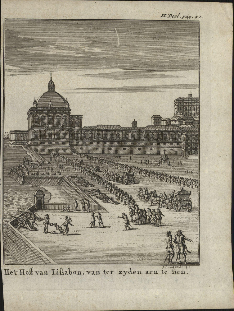 - opschrift midden onder afbeelding: Het Hoff van Lissabon, van ter zyden aen te sien