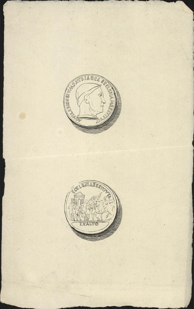 - opschrift op bovenste munt: AQVILEGIENSIVMPATRIARCA ECCLESIA MRESTITVIT