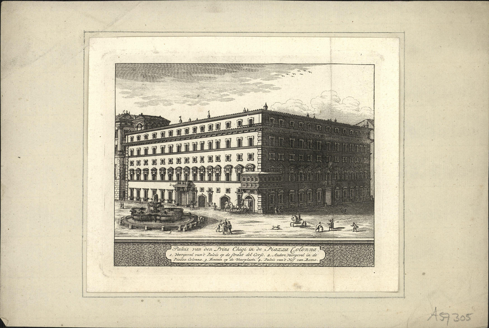 - titel midden boven in de afbeelding in de cartouche: Paleis van den Prins Chigi in de Piazza Colonna.