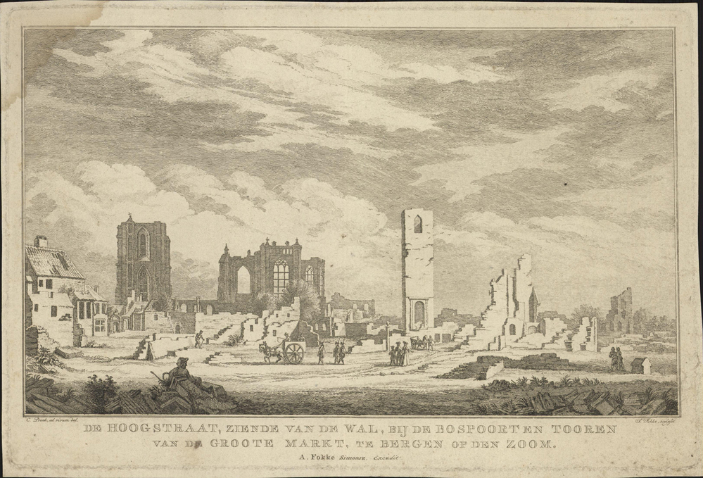 volledige titel: De Hoogstraat, ziende van de Wal, bij de Bospoorten Tooren van de Groote markt, te bergen op den Zoom.- Trefwoorden