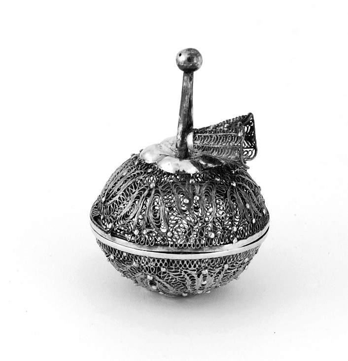 Lage bolvormige vrucht in filigrain, in het midden horizontaal deelbaar. De vlakke bodem heeft de vorm van een bloemblad, de bovenhelft/deksel heeft op de bovenzijde een klavertje vierblad, een loszittende rechte steel met een bolletje op het uiteinde en op de onderzijde van deze steel een vierkantig gevormde filigrain bloemkelk.