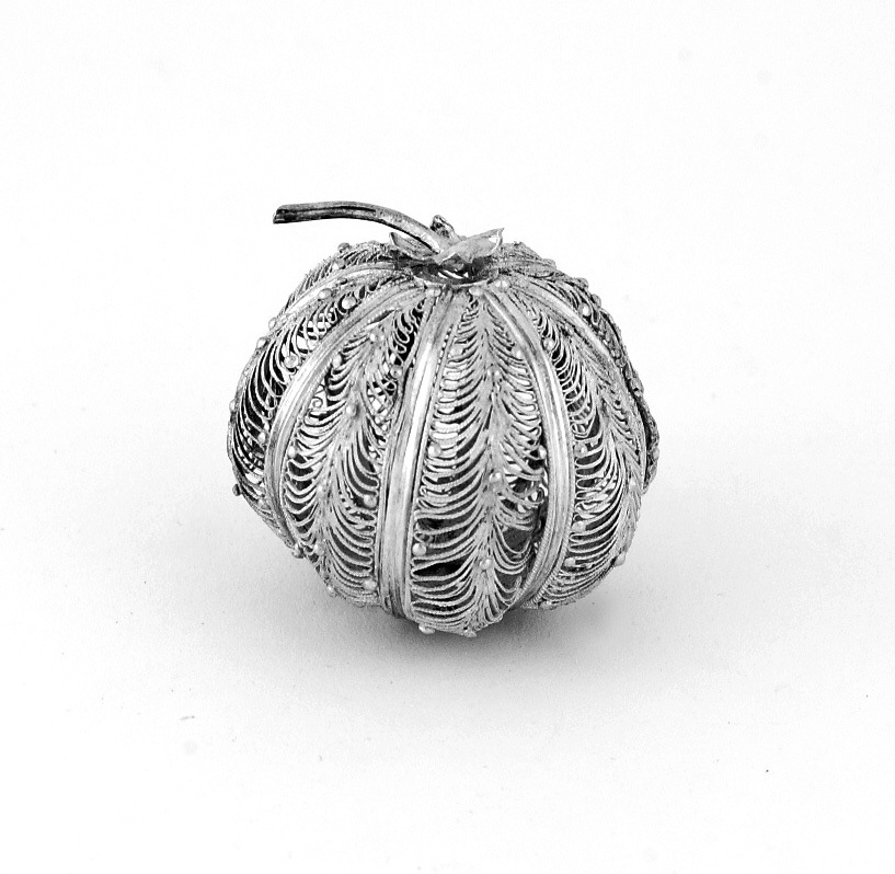 Lage niet deelbare bolvormige vrucht met vlakke bodem in de vorm van een bloemblad; de bovenzijde heeft een zespuntig blaadje waaruit een steel. Het geheel uitgevoerd in 8 parten, ingevuld met filigrain.- Trefwoorden