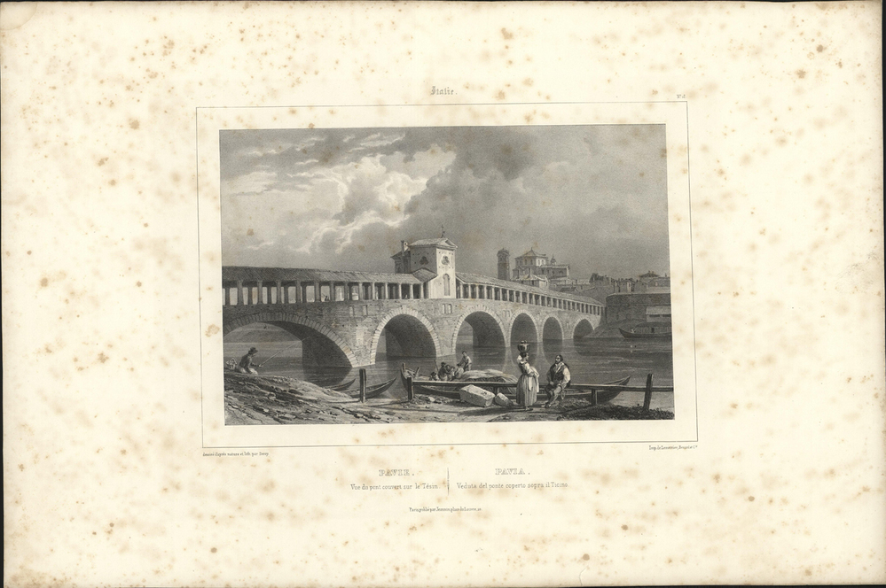 titel midden onder de afbeelding: Pavie. / Vue du pont couvert sur le Tésin.