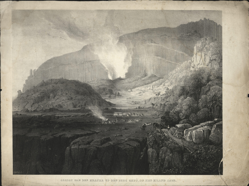 titel onder de afbeelding: Gezigt van den krater op den berg Gedé, op het eiland Java - aangetroffen 1985-02