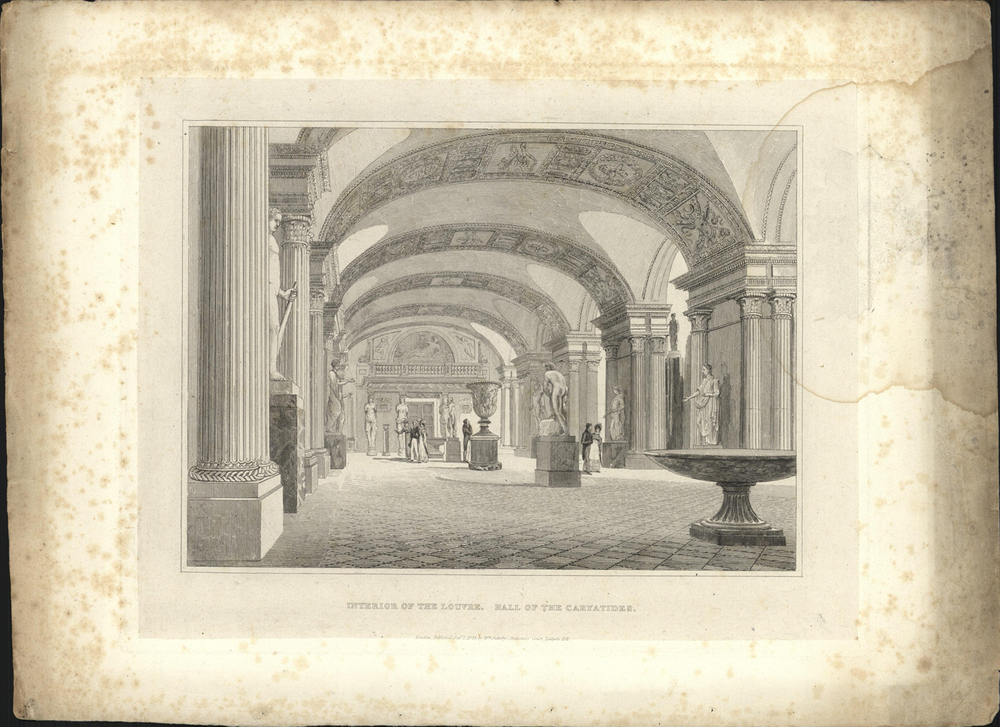 - opschrift in marge: INTERIOR OF THE LOUVRE. HALL OF THE CARYATIDES. / London, Published Jan. 1, 1823 by Wm. Suttaby. Stationers Court, Ludgate Hill.