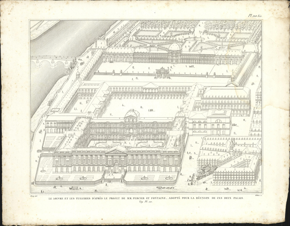 opschrift marge onder afbeelding: LES TUILERIES ET LE LOUVRE D'APRÈS LE PROJECT DE MM. PERCIER ET FONTAINE, ADOPTÉ POUR LA RÉUNION DE CES DEUX PALAIS. - aangetroffen 1985-02