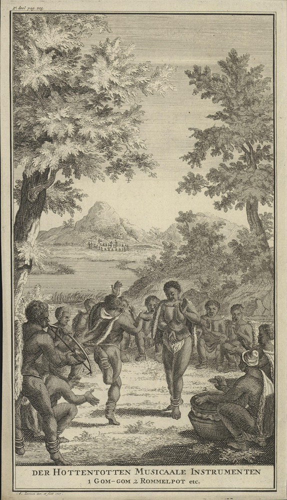 titel onder de afbeelding: Der Hottentotten Musikaale Instrumenten