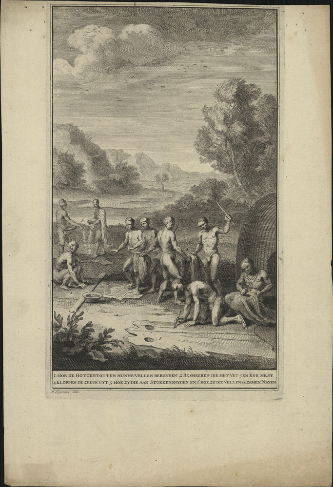 opschrift onder de afbeelding: 1. Hoe de Hottentotten hunne Vellen Beryden. 2. Besmeeren met Vet 3 en Koemest. 4 Kloppen de zelve uyt 5 Hoe zy die aan Stukkensnyden en 6 hoe zy die Vellen te zamen Nayen
