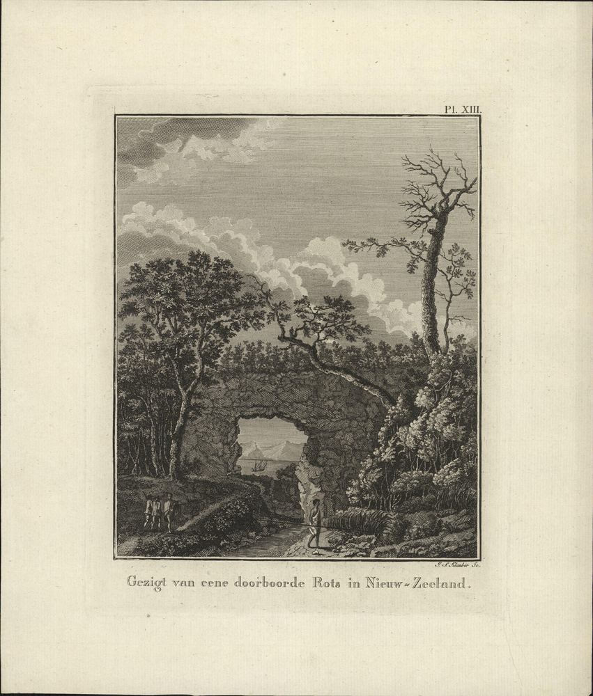 titel midden onder de afbeelding: Gezigt van eene doorboorde Rots in Nieuw-Zeeland.