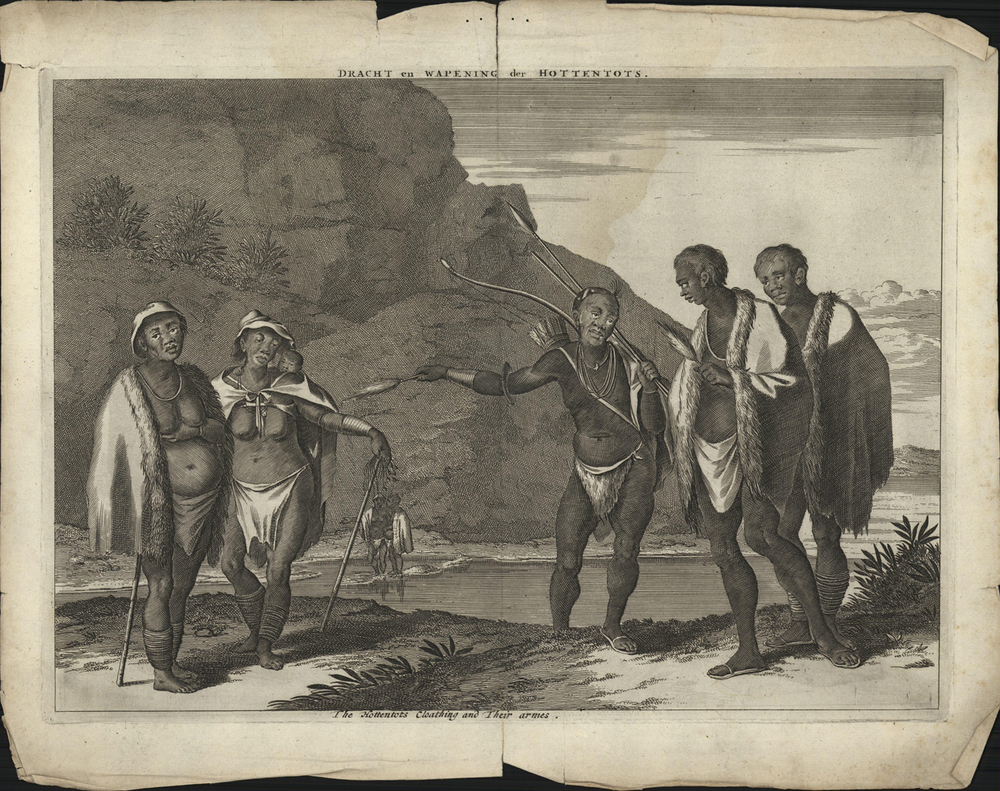 opschrift midden onder de afbeelding: The Hottentots Clothing and Their armes. - aangetroffen 1985-02