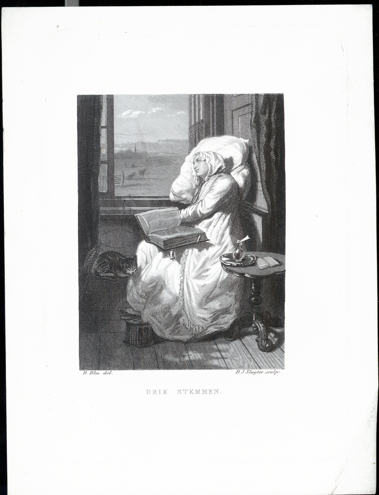 Zieke vrouw op stoel met stoof en groot kussen, kijkt uit open raam. Op haar schoot een opengeslagen boek- Trefwoorden