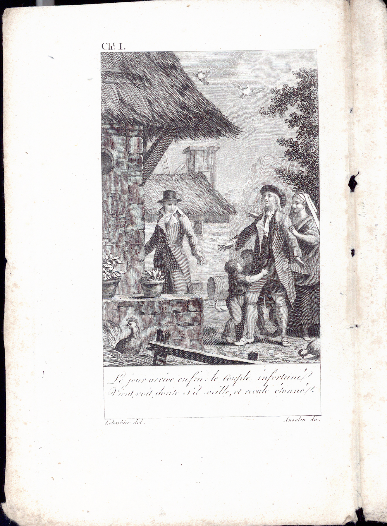 - opschrift onder de afb.: Le jour arrive enfin: le couple infortuné Vient, voit, doute s'il veille, et recute étonné. : fragment uit het gedicht van Delille, Vers 1, 'La Pitié'