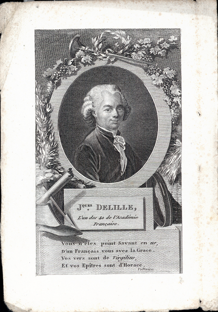 - opschrift m.o. in de afb.: Jques Delille, L'un des 40 de l"Acadénie Française. Voud n'êtes point Savanten us, D'un Français vous avez la Grace. Vos vers sont de Virgilius, Et vos Epîtres sont d'Horace. Voltaire