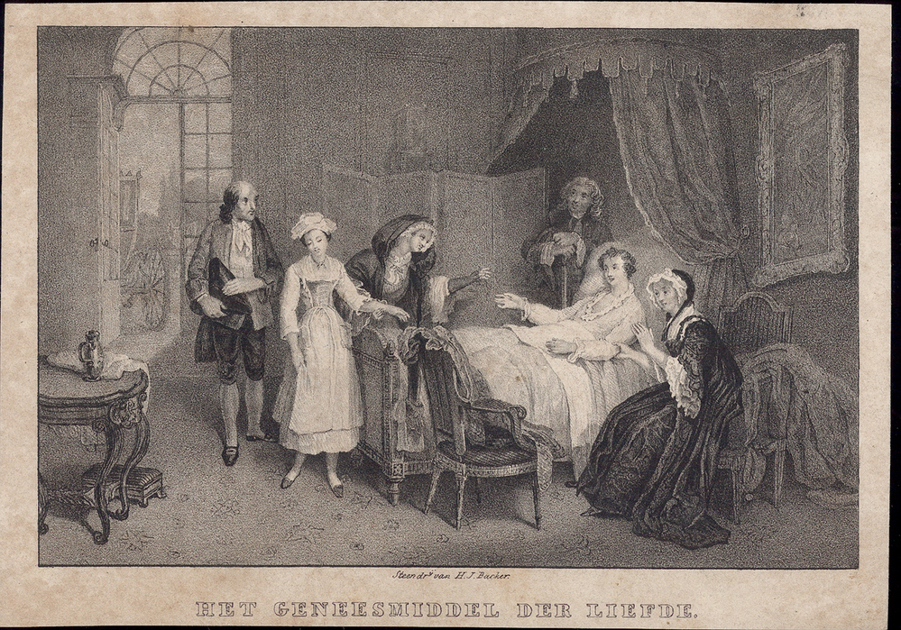 Gezelschap in een slaapkamer rond een bed met een jongeling met liefdesverdriet- Trefwoorden