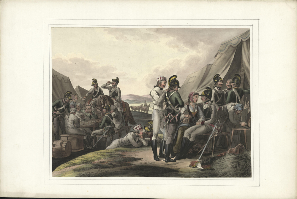 Soldaten ontspannen zich met kaartspel en vrouwelijk bezoek.- Trefwoorden