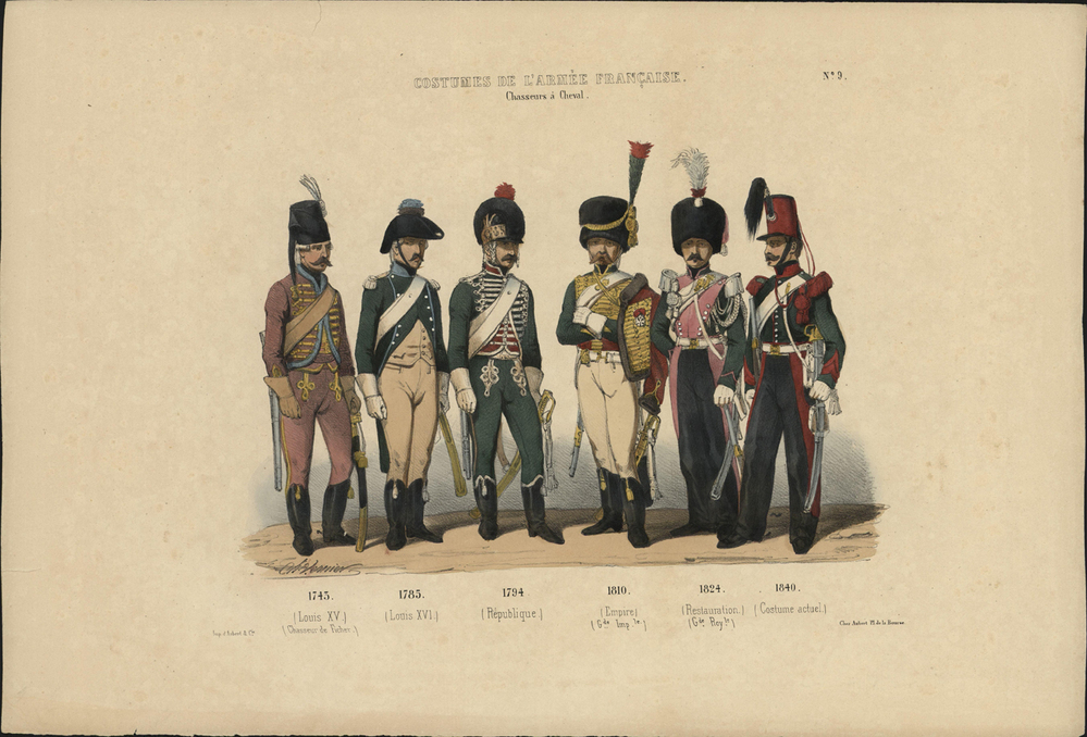 opschrift onder afbeelding: 1743./ (Louis XV.)/ (Chasseur de Ficher.) 1785./ (Louis XVI.) 1794./ (République.) 1810./ (Empire.)/ (G[ar]de Imp[eria]le.) 1824./ (Restauration)/ (G[ar]de Roy[a]le.) 1840./ (Costume Actuel.)