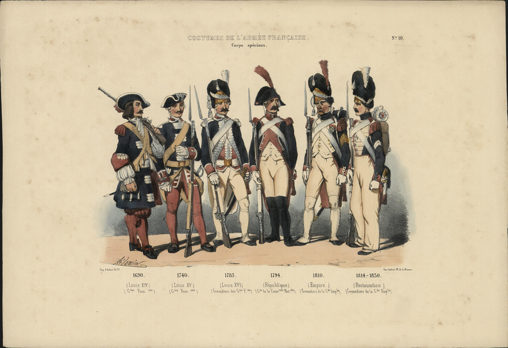 opschrift onder afbeelding: 1690./ (Louis XIV.)/ (G[ar]des Fran[çai]ses.) 1740./ (Louis XV.)/ (G[ar]des Fran[çai]ses.) 1785./ (Louis XVI.)/ (Grenadiers des G[ar]des F[rançai]ses.) 1794./ (République.)/ (G[ar]de de la Conv[en]tion Nat[ion]ale.) 1810./ (Empire.)/ (Grenadiers de la G[ar]de Imp[iria]le.) 1814-1830./ (Restauration.)/ (Grenadiers de la G[ar]de Roy[a]le.)