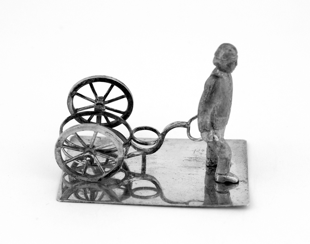 Een manfiguur (straatveger), die een kar trekt voor een grootvuilvat en mogelijk een kleinere vuilmand? Deze figuur gezien op oude foto's tentoostelling 'IJzeren eeuw"