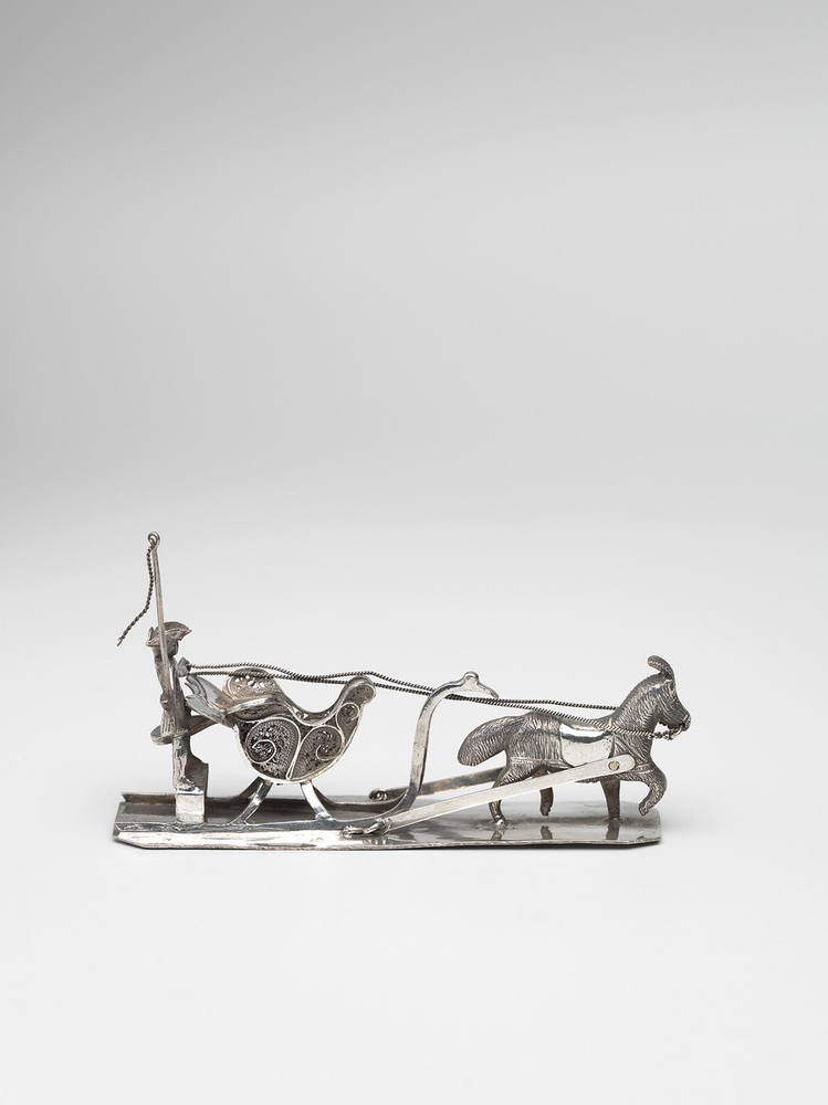 Deze miniatuur slede lijkt in een draf voort te glijden over het ijs. Het paard is fraai opgetuigd en heeft een hoofdstel met verenpluim. De zijkanten van de bak zijn opengewerkt met filigrain zilver. De glij-ijzers komen aan de voorkant bijeen in de vorm van een zwanenhals met kop. De koetsier zit wijdbeens op de achterbok met voetsteun. Hij draagt een driekantige steek van een model dat ongeveer honderd jaar eerder in de mode was. ( Bert Vreeken)