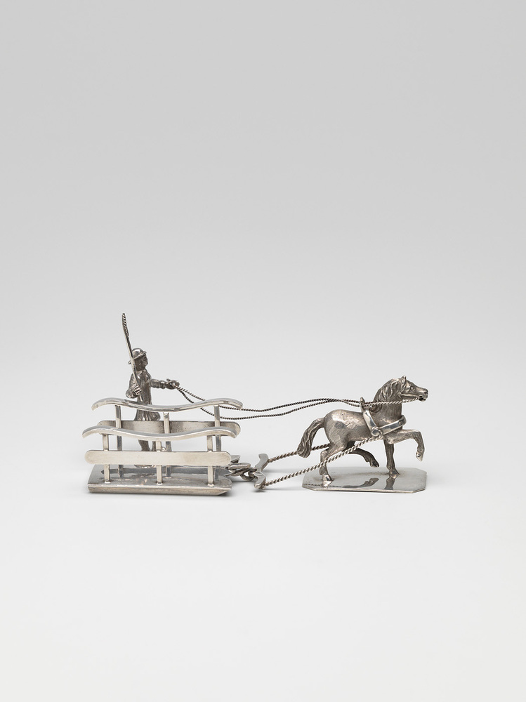 Platte slede met twee leuningen getrokken door een paard; links van de slede loopt een voerman .