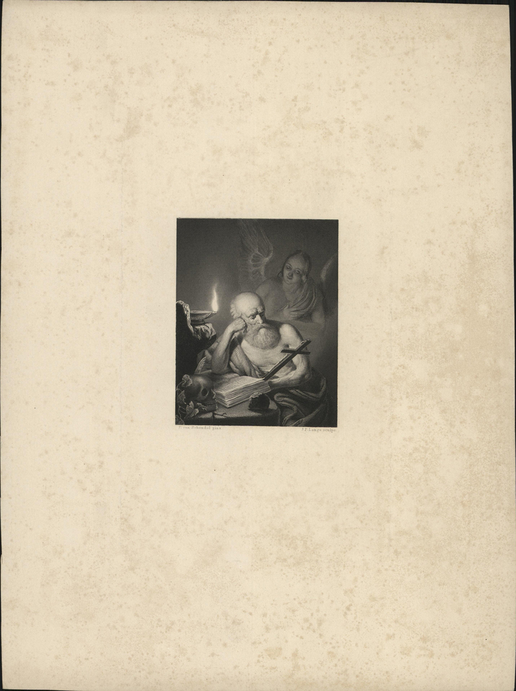peinzende Hieronymus met engel, olielamp, boek, schedel en kruis.- Trefwoorden