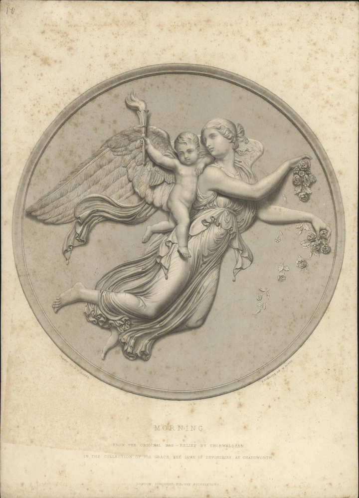 opschrift midden onder de afbeelding: MORNING. / From the original bas-relief by Thorwaldsen. / In the collection of his grace the Duke of Devonshire at Chatsworth. / London, Published for the Propietors.