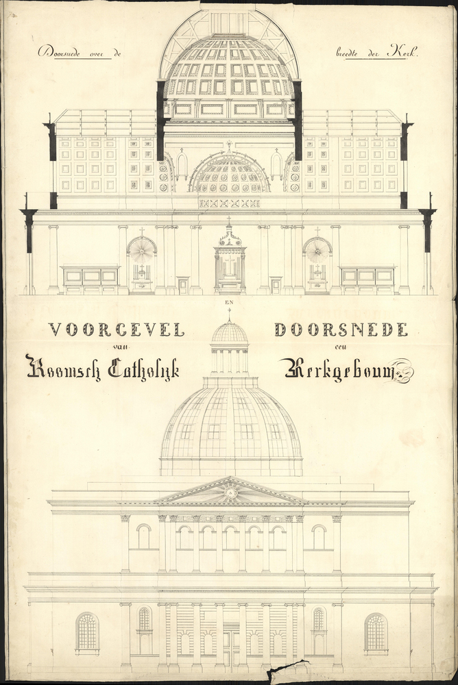 - titel midden in de afbeelding: Voorgevel doorsnede van een Roomsch Catholiek Kerkgebouw