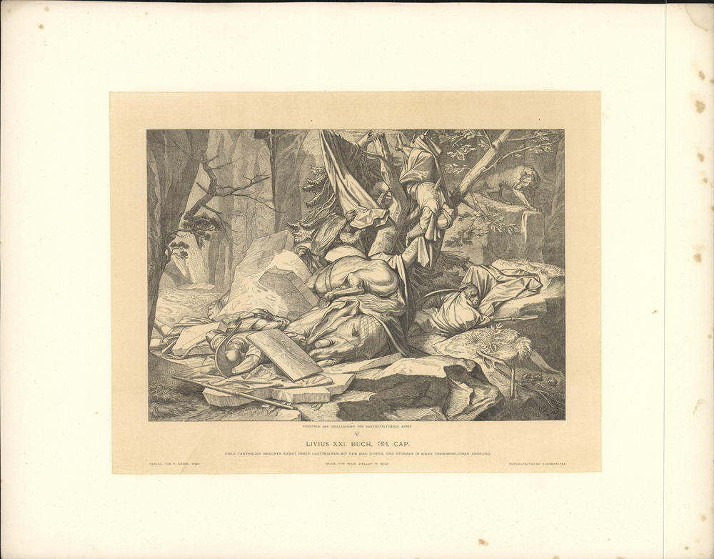 - opschrift onder de afb. onder de titel: Viele Carthager brechen sammt ihren lastthieren mit dem eise durch, und stürzen in einen unermesslichen abgrund.
