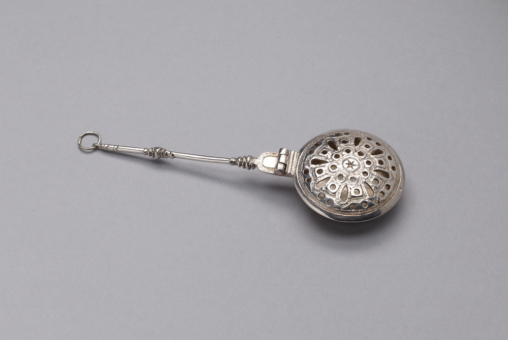 Ronde pan met vlakke bodem en wand met omgeslagen rand, waarop een scharnierend opengewerkt en gewelfd deksel ligt; onder scharnierlid begint de ronde gladde, ingekorte steel versierd met gedraaide ringen-knoppen en het uiteinde voorzien van een oog met ophangring.