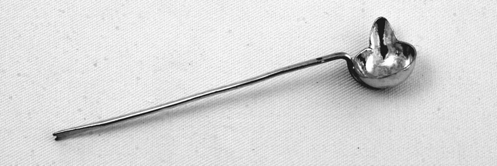 Bolvormige bak met schenktuit en ronde steel, uiteinde plat gesmeed met afgebroken ophangoog; de andere kant met naaldaanzet de bak volgend tot het centrum en haaks omgezet.- Trefwoorden