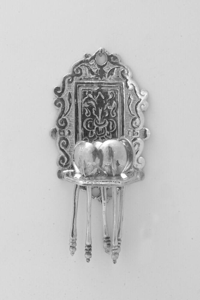 Vlakke wandplaat met S-vormige omlijsting en in het midden een rechthoek waarin een Franse lelie, met hieronder het horizontale vijfzijdige draagbord en geprofileerde rand met plaats voor zes lepels.