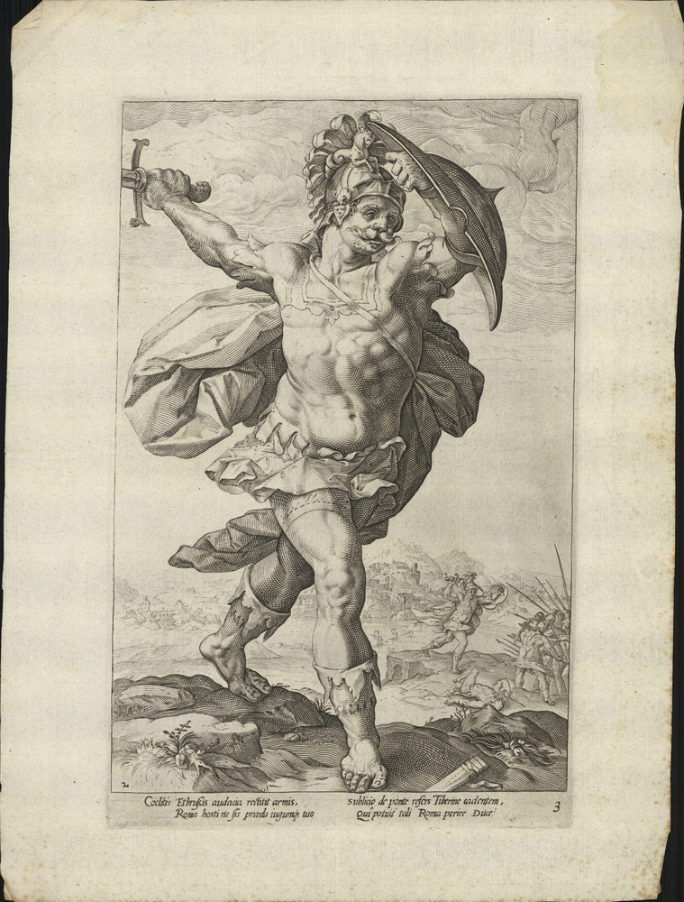: Vertaling: De moed van Cocles heeft de legers van de Etrusken weerstand geboden, om te voorkomen dat u, Rome, een prooi voor uw vijand wordt en door hem wordt onderworpen. Tiber, u vertelt dat hij van de Paalburg viel; hoe had Rome ten onder kunnen gaan met zo'n aanvoerder? [H. Leeflang, Hendrick Goltzius, tekeningen, prenten en schilderijen, 2003, pp. 90.]