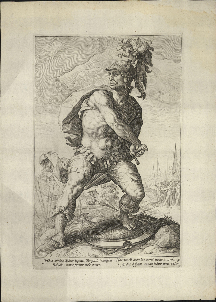 : Vertaling: Manlius verdiende door het doden van de vijand de naam Torquatus en daardoor nam Italië's roem in de wereld toe. Rome heeft vele Torquati gehad: ben je dan nog verbaasd dat Aarde en Zee zijn bevel gehoorzamen. [H. Leeflang, Hendrick Goltzius, tekeningen, prenten en schilderijen, 2003, pp. 90.]