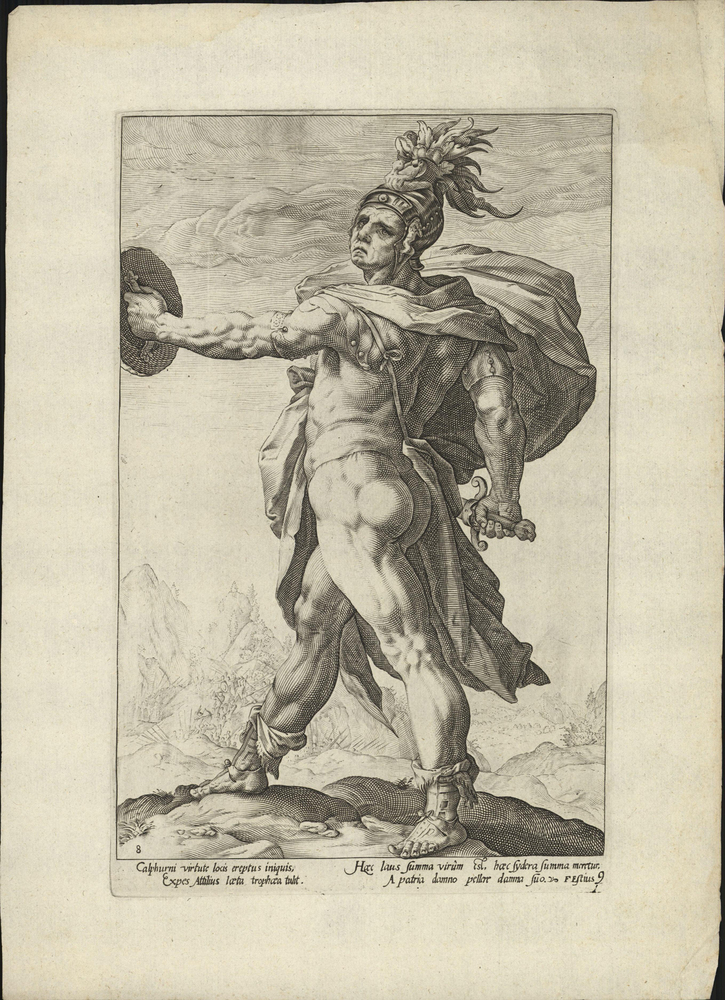 : Vertaling: Nadat Atilius door de moedige Calpurnius uit een gevaarlijke streek was gered, behaalde hij als vrij man een breugevolle zege. DIt is de hoogste lof die mannen kunnen krijgen, hiermee verdienen ze hemelhoge roem: de ondergang van het vaderland te voorkomen door hun eigen ondergang. [H. Leeflang, Hendrick Goltzius, tekeningen, prenten en schilderijen, 2003, pp. 90.]