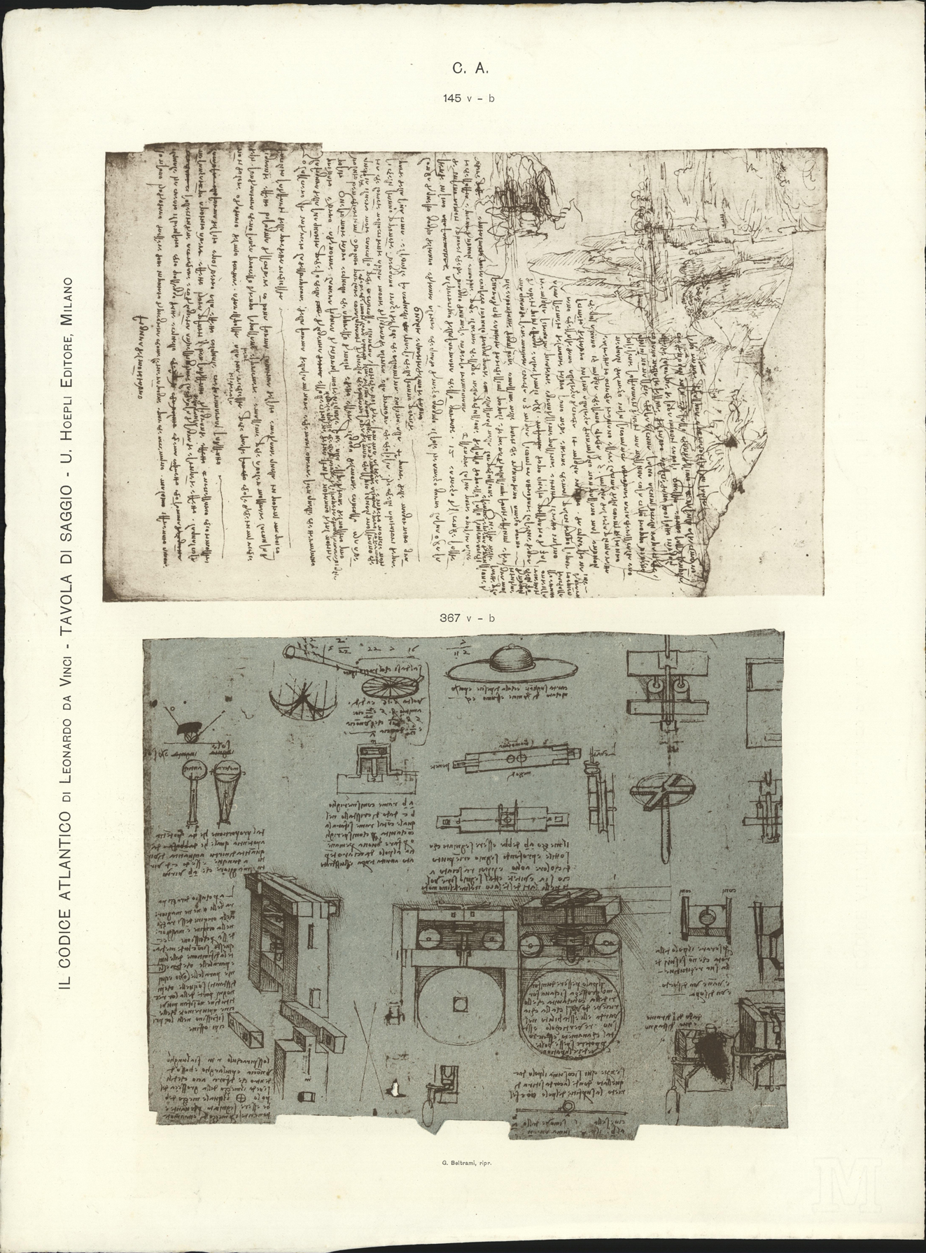 opschrift links van de afbeelding: Il codice atlantico di Leonardo Da Vinci . Tavola di saggio . U. Hoepli Editore, Milano