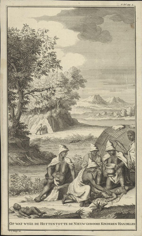 titel midden onder de afbeelding: Op wat wyze de Hottentotten de Nieuw geboore Kinderen Handelen