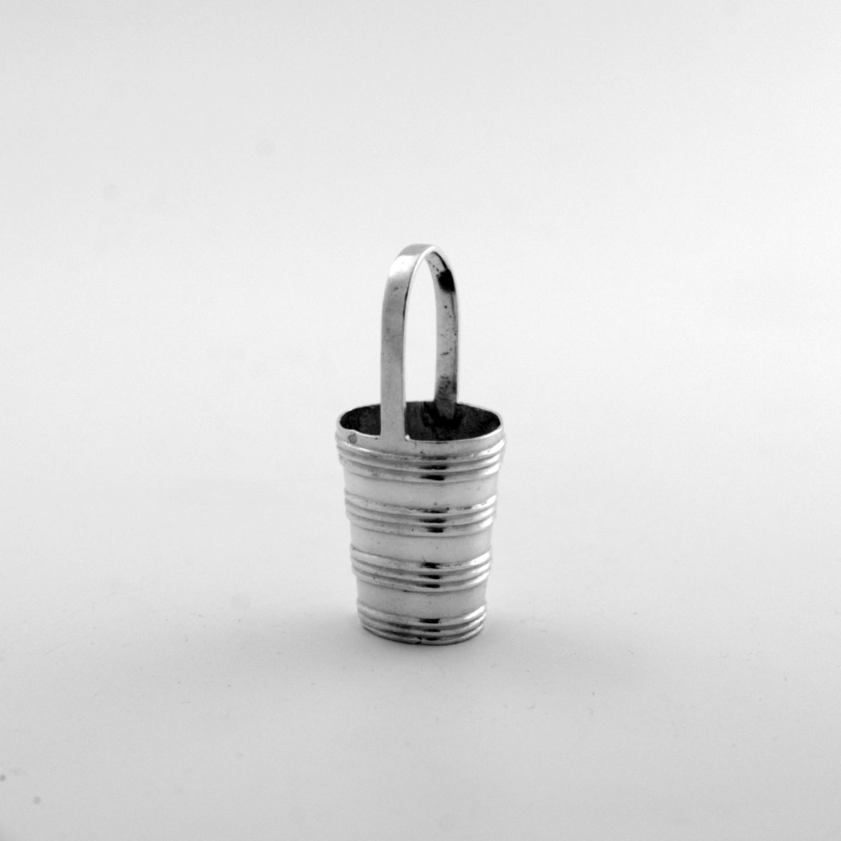 Ovale smalle hoge emmer met op de wand vier banden en met een plat glad gebogen hengsel uitlopend van de wand.- Trefwoorden