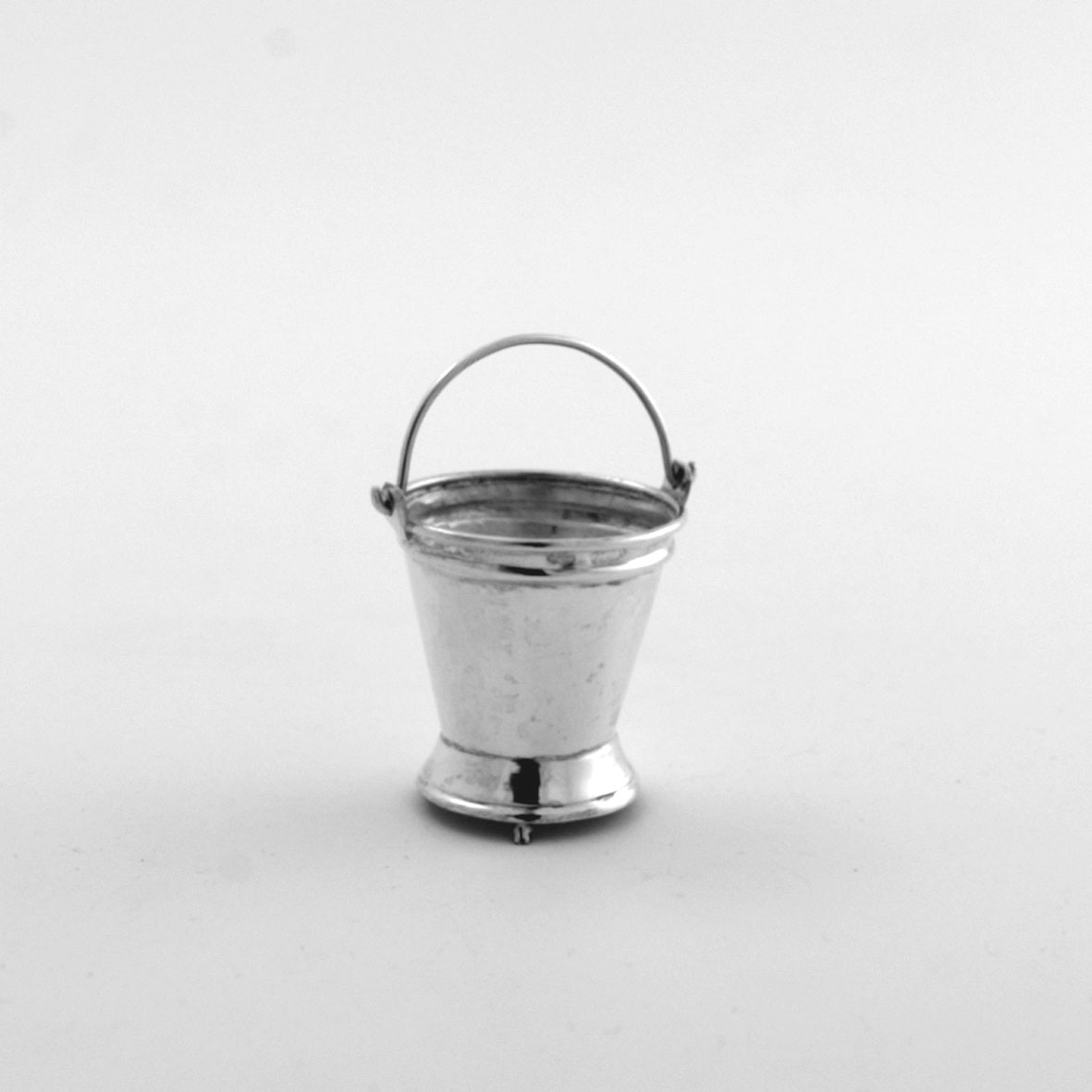 Ronde emmer met insnoerende voet en velsrand, waaronder drie pootjes, gladde wand wijd uitlopend ingewalsde rand en velsrand met twee aangezette ogen waarin een halfrond gebogen hengsel.