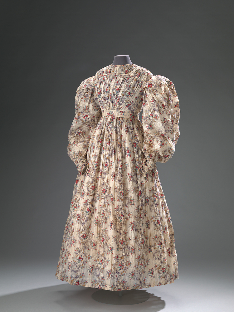 Deze gebloemde japon komt uit de Biedermeiertijd (1815-1848). Dit is terug te zien in het kleine bloemmotief, de afhangende schouders, de hoogte van de taille – die na de Empiretijd (begin 19e eeuw) weer iets teruggezakt is richting de natuurlijke plaats – en de wijde mouwen. Zulke mouwen worden ook wel schapenboutmouwen genoemd. Door de laag ingezette mouwen kon de draagster zich niet vrij bewegen, wat het destijds geliefde beeld opleverde van een tere dame: deugdzaam, huiselijk en vooral niet geschikt voor zwaar werk. ( Sarah Remmerts de Vries)