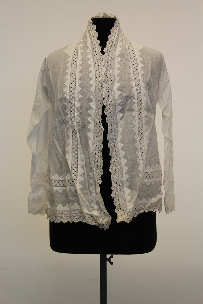Bedjasjes, of slaapjakjes, werden vroeger gedragen voor wat extra warmte onder de deken. Dit witte bedjasje stamt van rond 1900. Het jasje is van eenvoudige effen stof gemaakt, maar rond de voorzijdes en onderkant afgezet met een gehaakte rand als garnering. ( Sarah Remmerts de Vries)