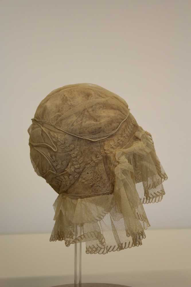 Huismuts van tule met stofapplicatie en vulkoord. De muts is verkeerd om. De katoenen voering is er later in gezet. Hierbij is de muts binnenste buiten gedraaid. Het tunneltje in de hals ontbreekt.
