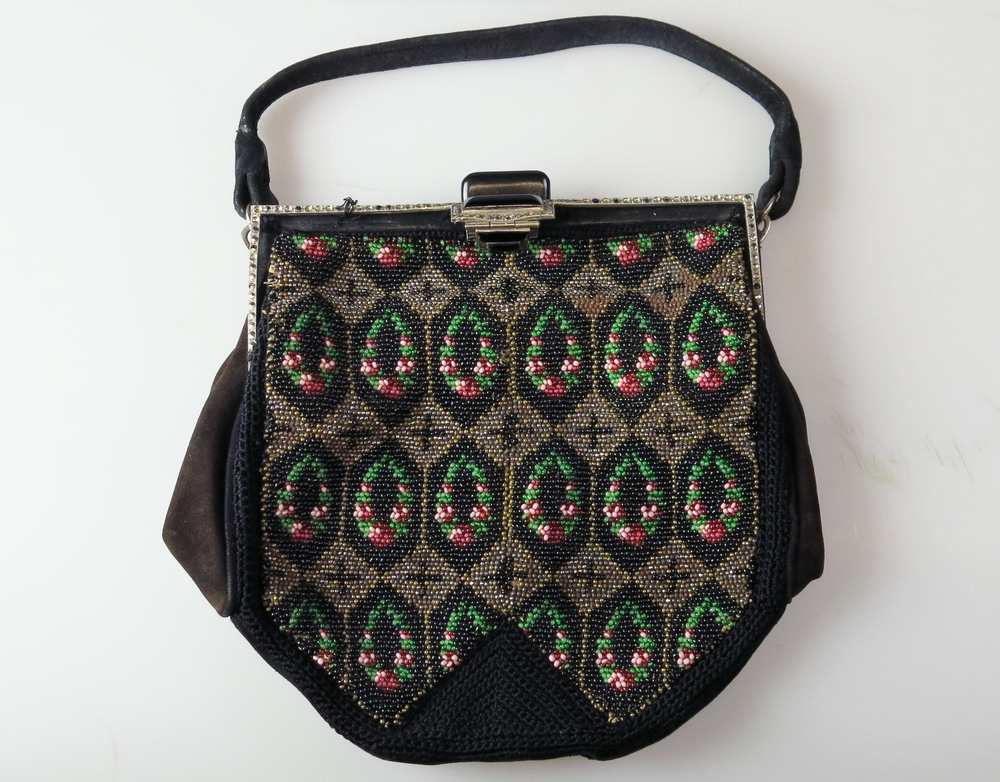 Deze kleine, zwarte handtas is afkomstig uit de familie van Margaretha Kruijswijk-Schröder, die getrouwd was met Jan Kruijswijk, de oudste zoon van Amsterdamse Schoolarchitect Cornelis Kruijswijk (1884-1935). Cornelis Kruijswijk bouwde een groot aantal woonblokken in de uitbreidingswijken van Amsterdam-West, onder meer in de Mercatorstraat, en leverde een bijdrage aan Berlages Plan Zuid met de bebouwing rond het Victorieplein. Hij staat echter vooral bekend om zijn vele kerken en scholen op protestants-christelijke grondslag. Met zijn vrouw Jantien, een deftige dame die hield van mooie kleding, kreeg hij zes kinderen. Deze handtas is het product van verschillende materialen en technieken. Op het gehaakte, zwarte gedeelte aan de voor- en achterzijde van de tas zijn kraaltjes aangebracht in de kleuren zwart, goud, zilver, groen, roze en rood. Deze vormen een motief van kruisjes en gouden lijsten, met daarin guirlande-achtige figuren in een ovale vorm. ( Sarah Remmerts de Vries)