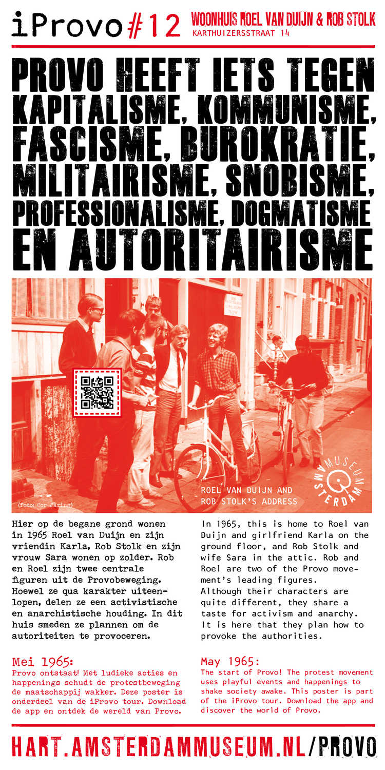 iProvo #12: Hier op de begane grond wonen in 1965 Roel van Duijn en zijn vriendin Karla; Rob Stolk en zijn vrouw Sara wonen op zolder. Rob en Roel zijn twee centrale figuren uit de Provobeweging. Hoewel ze qua karakter uiteenlopen, delen ze een activistische en anarchistische houding. In dit huis smeden ze plannen om de autoriteiten te provoceren. ( Annemarie de Wildt)