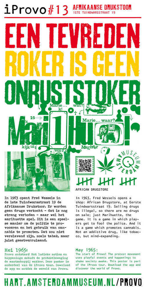 iProvo #13: In 1963 opent Fred Wessels in de 1ste Tuindwarsstraat 19 de Afrikaanse Drukstoor. Er worden geen drugs verkocht – dat is nog streng verboden – maar wel het marihuette spel. Dit is een speelse manier om de politie te provoceren en het gebruik van cannabis te promoten. Dat zou niet verslavend zijn, zoals tabak, maar juist geestverruimend. ( Annemarie de Wildt)