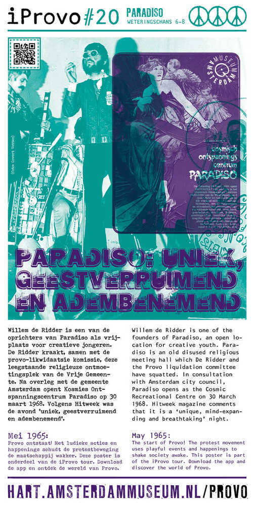 iProvo #20: Willem de Ridder is een van de oprichters van Paradiso als vrijplaats voor creatieve jongeren. De Ridder kraakt, samen met de provo-likwidaatsie komissie, deze leegstaande religieuze ontmoetingsplek van de Vrije Gemeente. Na overleg met de gemeente Amsterdam opent Kosmies Ontspanningscentrum Paradiso op 30 maart 1968. Volgens Hitweek was de avond ‘uniek, geestverruimend en adembenemend’. ( Annemarie de Wildt)