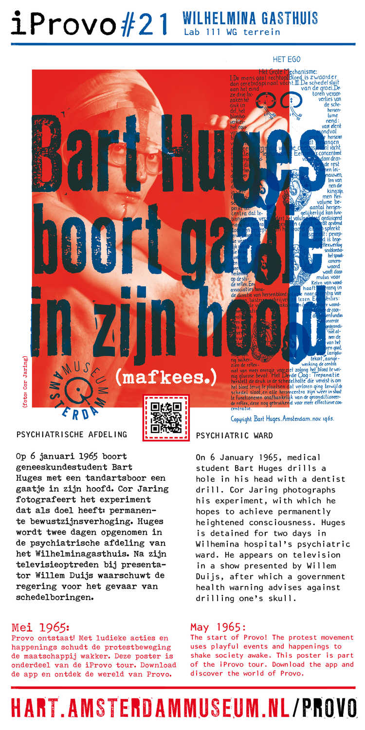 iProvo #21: Op 6 januari 1965 boort geneeskundestudent Bart Huges met een tandartsboor een gaatje in zijn hoofd. Cor Jaring fotografeert het experiment dat als doel heeft: permanente bewustzijnsverhoging. Huges wordt twee dagen opgenomen in de psychiatrische afdeling van het Wilhelminagasthuis. Na zijn televisieoptreden bij presentator Willem Duijs waarschuwt de regering voor het gevaar van schedelboringen. ( Annemarie de Wildt)