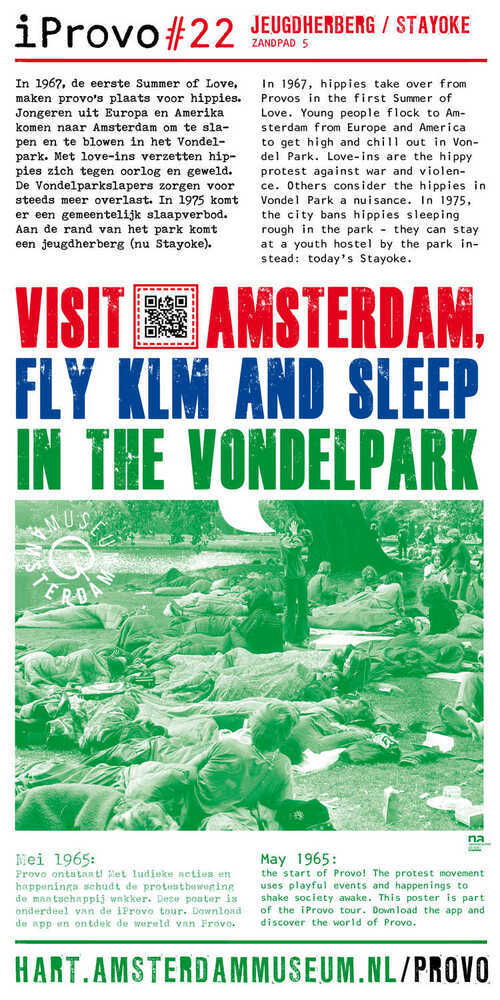 iProvo #22: In 1967, de eerste Summer of Love, maken provo’s plaats voor hippies. Jongeren uit Europa en Amerika komen naar Amsterdam om te slapen en te blowen in het Vondelpark. Met love-ins verzetten hippies zich tegen oorlog en geweld. De Vondelparkslapers zorgen voor steeds meer overlast. In 1975 komt er een gemeentelijk slaapverbod. Aan de rand van het park komt een jeugdherberg (nu Stayoke). ( Annemarie de Wildt)