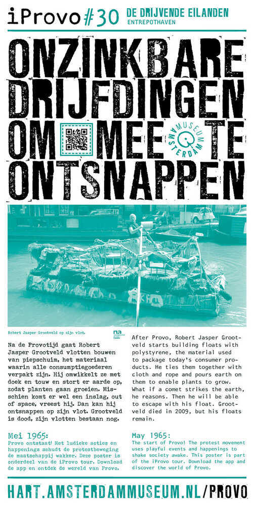 iProvo #30: Na de Provotijd gaat Robert Jasper Grootveld vlotten bouwen van piepschuim, het materiaal waarin alle consumptiegoederen verpakt zijn. Hij omwikkelt ze met doek en touw en stort er aarde op, zodat planten gaan groeien. Misschien komt er wel een inslag, out of space, vreest hij. Dan kan hij ontsnappen op zijn vlot. Grootveld is dood, zijn vlotten bestaan nog. ( Annemarie de Wildt)