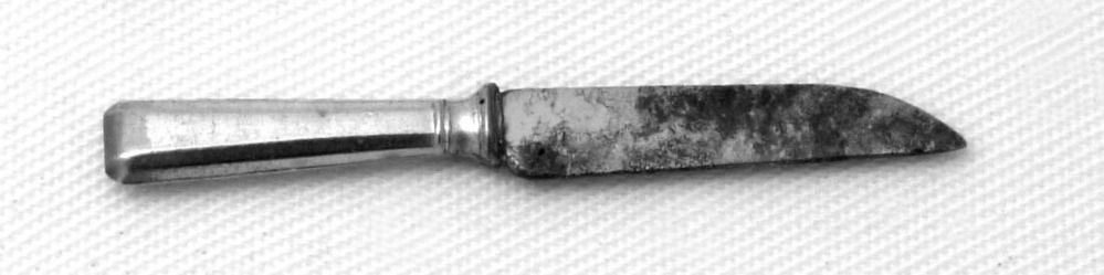 Mes met zeszijdig heft, uiteinde rechthoekig afgerond, kraag met lemmet, dat evenwijdig uitloopt in een punt naar het snijvlak.- Trefwoorden
