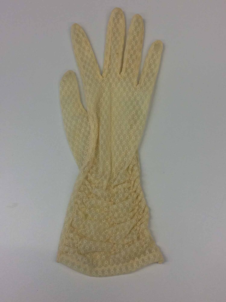 Handschoen (links) van lichtgele synthetische tricot, machinaal geborduurd met stippenmotief. Bovenop de pols gerimpeld met drie draden rimpelelastiek.